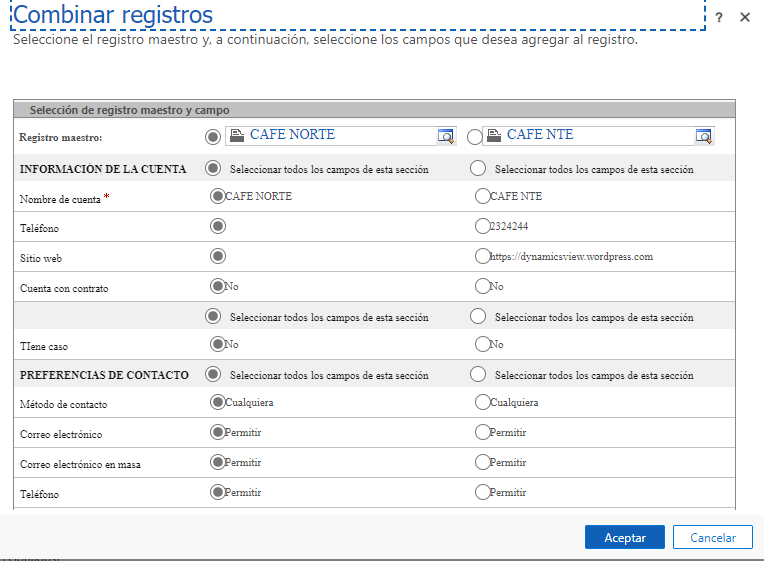 Combinar registros es una poderosa función en Dynamics365 que permite al usuario escoger que campos mantener de cada registro, de forma que no se pierde información relevante
