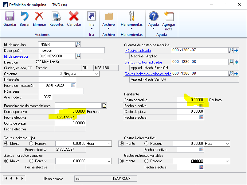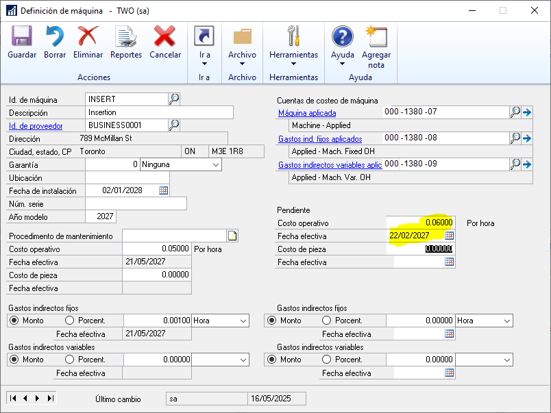 En GP actualizaron el costo operativo pendiente en la ficha de la maquina (Fabricación | Tarjetas | Máquina), y colocaron la fecha efectiva.